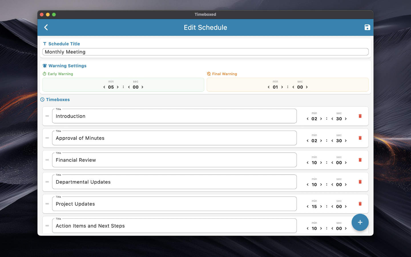 Use the blue plus button to add a new timebox. Change the order using the drag and drop functionality.